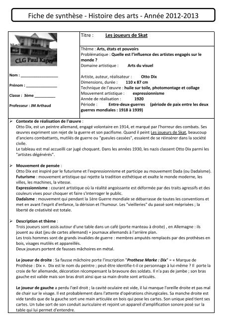Fiche De Révision Les Joueurs De Skat Otto Dix Salle09