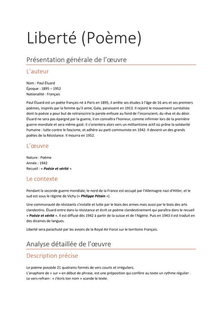 Voici des informations détaillées sur - Fiche Histoire Des Arts Liberté Paul Eluard. -