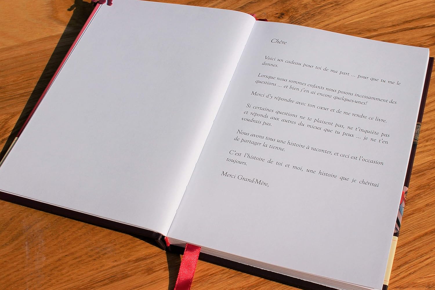 Je trouve ce principe vraiment super. Le livre à écrire grand mère raconte ton histoire aux editions wartberg est joli il y a à lintérieur une trame de questions pour que je puisse le compléter avec précision.