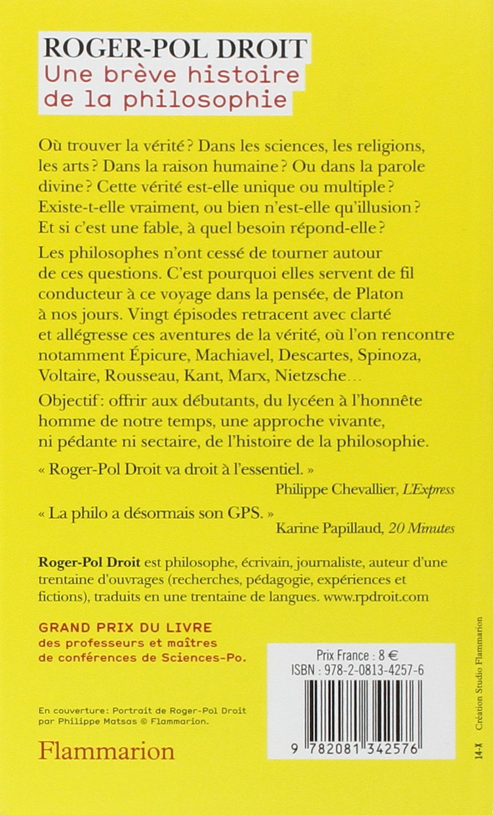 Je conseille ce livre à toute personne qui veut connaître lunivers de la philosophie. 3 1251538 une brève histoire de la philosophie roger pol droit flammarion 2008 french bookseller. Lauteur parcoure lhistoire de la philosophie et explique de façon claire les concepts et idées des grands noms de la philosophie.