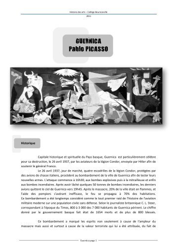 De plus le noir et blanc est un rappel du texte et des clichés de guernica diffusés dans la presse à la suite des bombardements. Lisez ce art dissertations gratuits et plus de 223 000 autres dissertation. Voici un dossier dhistoire des arts fait par un membre de digischool brevet sur guernica de pablo picasso.