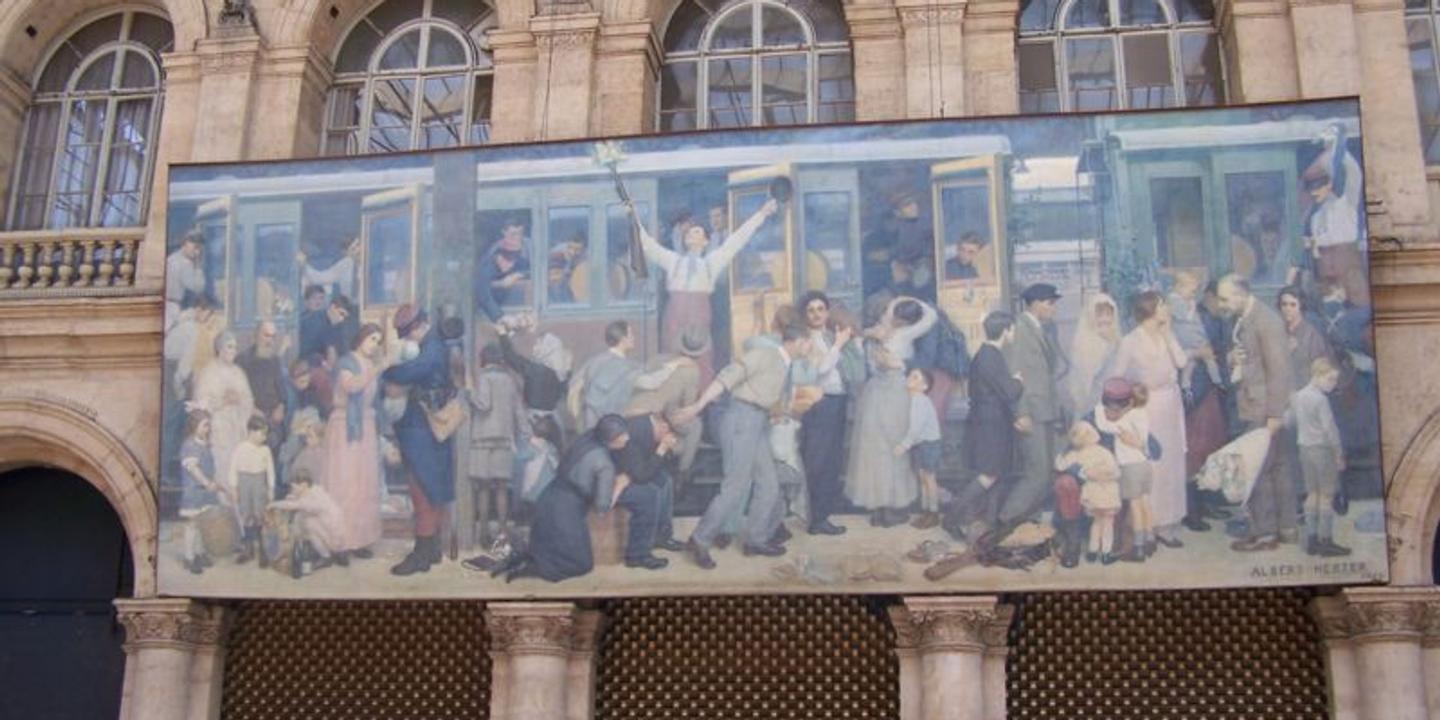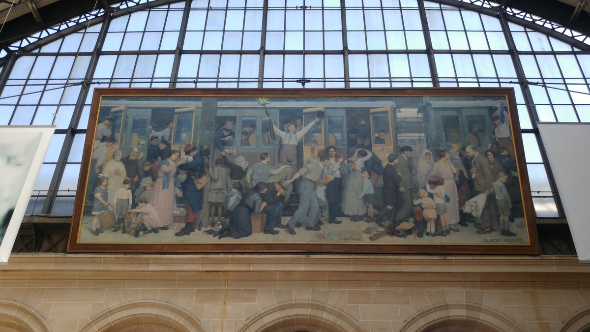 Le tableau le départ des poilus août 1914 accroché dans la gare de lest est lœuvre du peintre américain albert herter 1871 1950 qui loffrit à la france en 1926cest à la fois une fresque historique mettant en scène le départ des soldats mobilisés en août 1914 lœuvre du peintre compte plusieurs tableaux à sujet historique. Cette toile illustre le départ pour le front des soldats français les poilus mobilisés en 1914. Departure of the infantrymen august 1914 is a monumental mural by the american artist albert herterthe painting measures 12 by 5 metres 39 ft 16 ft and is displayed at the gare de lest railway station in paris where it is suspended some 7 metres 23 ft high on a wall in the hall dalsace.
