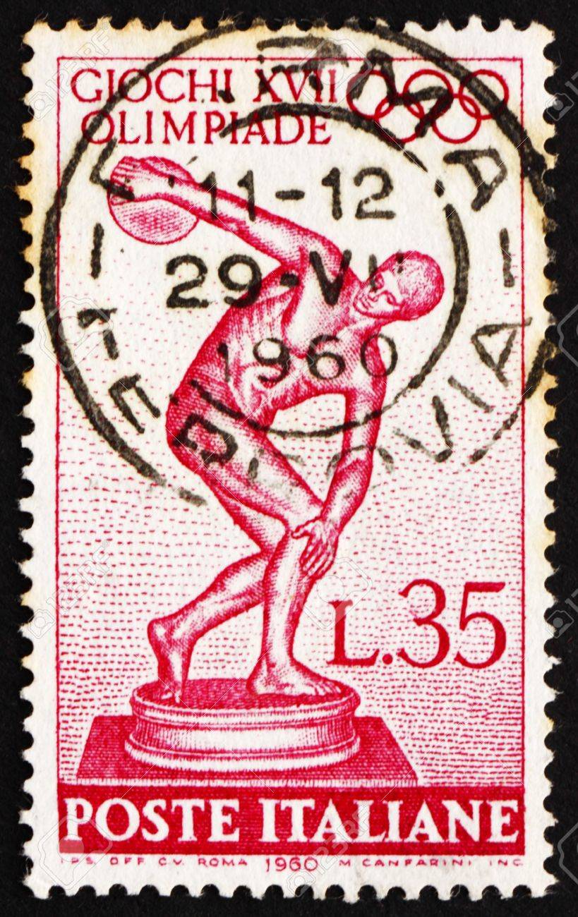 Italie Circa 1960 Un Timbre Imprimé En Italie Montre Statue De Discobole De Myron 17e Jeux Olympiques Rome Vers 1960