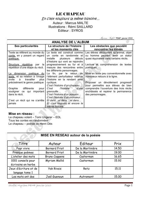 Le chapeau et cest toujours la même histoire par loulou47 dans lecture le 15 juin 2013 à 1900 cet album fait partie de ceux utilisés dans la méthode a lécole des albums que jutilise en partie en classe. Institut suisse jeunesse et médias. Syros situation initiale actions situation finale récit.